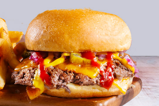 Two slices of cheddar cheese, diced red onions, pickles, ketchup and mustard. Served with fries.