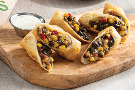Crispy flour tortillas, chicken, black beans, corn, Monterey Jack cheese, red peppers, spinach. Served with avocado-ranch.