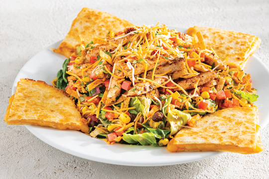 Grilled chicken, mixed cheese, tomatoes, corn salsa, tortilla strips, cilantro and citrus-balsamic vinaigrette on mixed greens. Topped with cheese quesadillas.