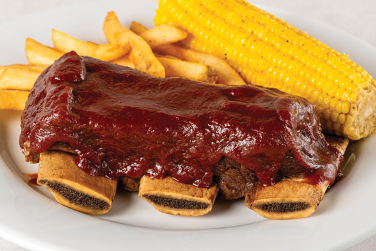 Slow-smoked and triple-basted tender beef ribs. Served with fries and sweet corn on the cob.