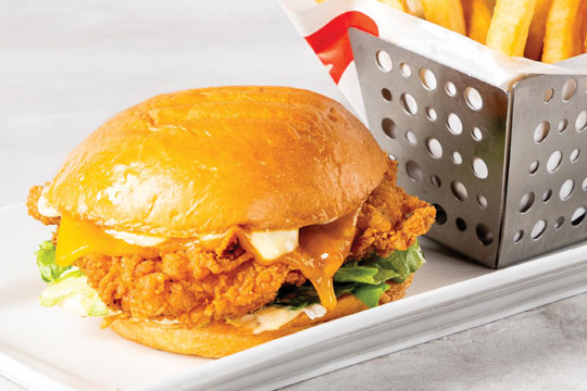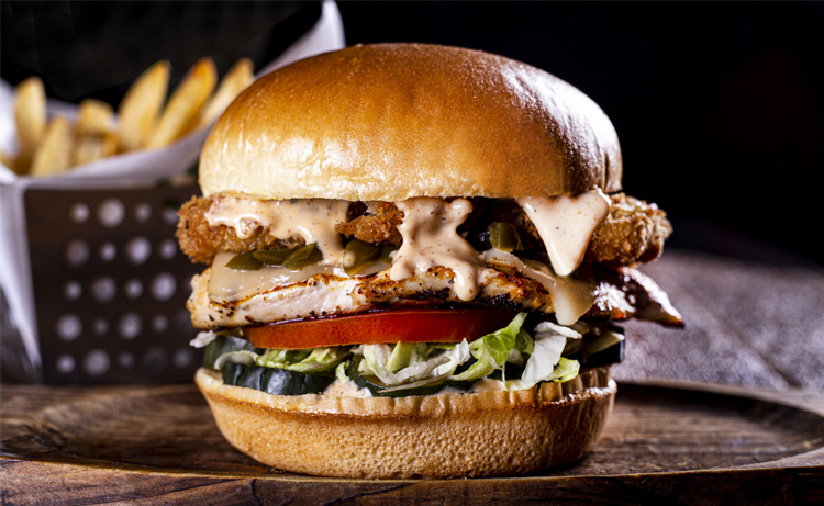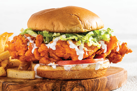 Spicy, Cajun-style grilled chicken with Swiss cheese, jalapeños, lettuce, pickles, tomato and ancho-ranch dressing, topped with crispy onion rings.