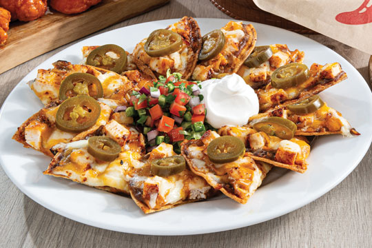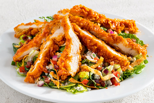 Hand-breaded crispy chicken tossed in Buffalo sauce, beef bacon, feta cheese crumbles, house-made pico and tortilla strips with house-made ranch.