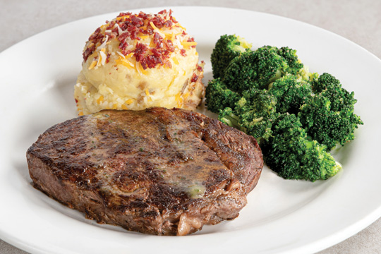 10oz. Marbled, thick-cut, seasoned ribeye steak in our own special seasonings, topped with