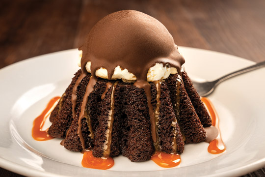 Our classic cake filled with a warm molten center, served over a drizzle of caramel and topped with vanilla ice cream coated in a chocolate shell.
