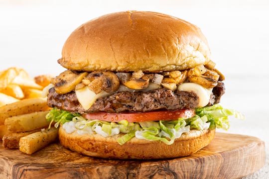 Fresh sautéed mushrooms, melted Swiss cheese, mayo, lettuce, tomatoes & pickles. Served with fries.