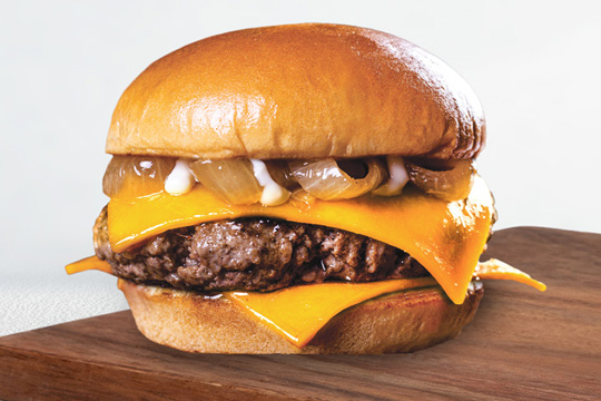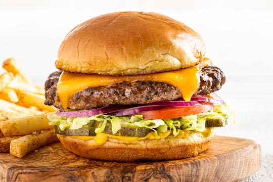 Beef patty with aged cheddar cheese, caramelized onions, pickles, mayo and mustard.