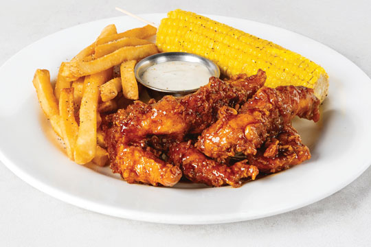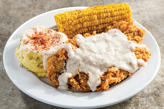 Hand-breaded crispy chicken, corn on the cob, mashed potatoes with black pepper gravy.