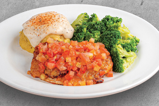 Grilled chicken breast topped with BBQ sauce, beef bacon, cheese and topped with diced tomatoes. Served with mashed potatoes with black pepper gravy & seasonal veggies.