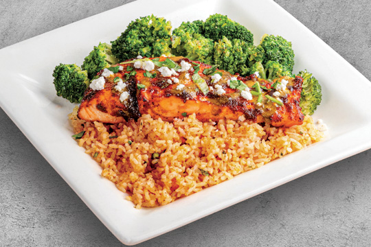 7 oz. seared ancho-rubbed fish, drizzled with citrus-chile sauce & topped with cilantro & crumbled feta cheese. Served with rice and seasonal veggies.