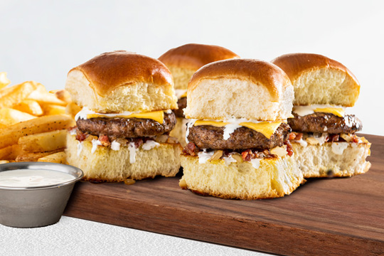 Four mini burgers with beef bacon, cheddar cheese, sautéed onions & house-made ranch.