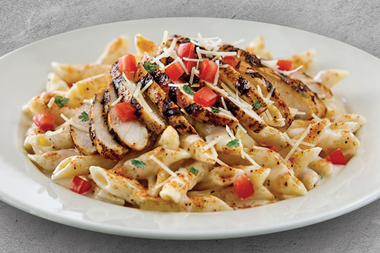 Penne in Alfredo sauce with Cajun spice. Topped with choice of protein, Parmesan cheese, diced tomatoes & cilantro.