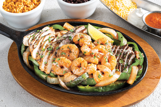 Sizzling to the table with green bell peppers and onions, topped with cilantro. Served with flour tortillas. Sour cream, house-made pico, salsa & mixed cheese included on the side.