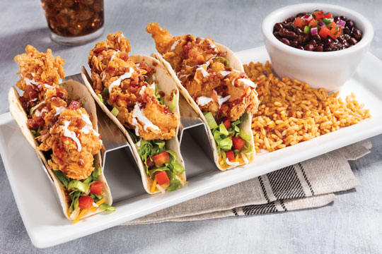 Soft flour tortillas filled with Crispy Chicken Crispers®, beef bacon, diced tomatoes, cheese, lettuce, honey-chipotle sauce and house-made ranch. Served with seasonal rice & black beans.