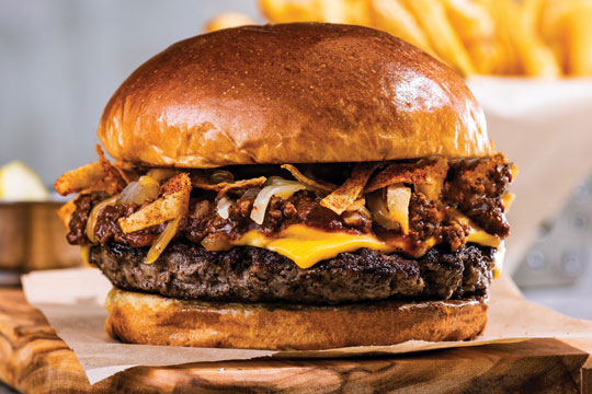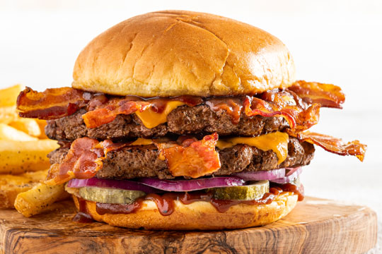 Two beef patties, six slices of beef bacon, BBQ sauce, cheddar cheese, red onion and pickles.