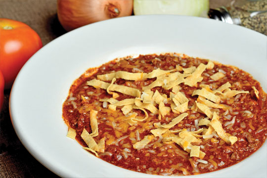 A hearty blend of ground beef, onions and signature spices slow-simmered in tomato sauce. Topped with cheese & tortilla strips.