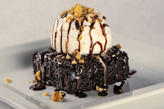 Warm, rich chocolate brownie topped with vanilla ice cream, chocolate drizzle and walnuts.