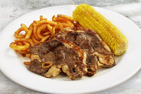 Tender lamb chump, grilled to perfection. Served with corn on the cob and crispy curly fries.