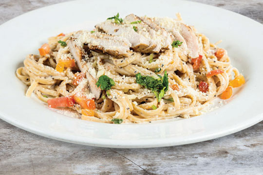 Linguine in creamy garlic cream sauce. Topped with a choice of protein, Parmesan cheese, diced tomatoes and cilantro and cajun spices.
