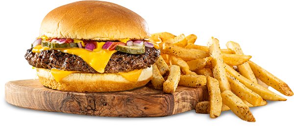 Two slices of cheddar cheese, diced red onions, pickles, ketchup and mustard. Served with fries. RM49.80