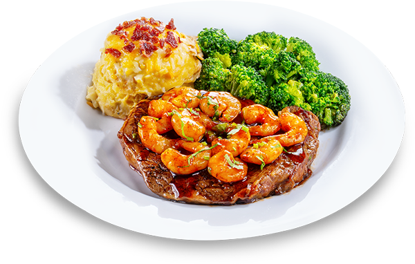 10oz seasoned ribeye topped with Cajun prawns and Honey-Chipotle sauce, served with loaded mash and seasonal veggies. RM111.30